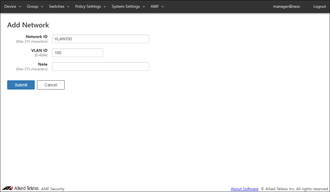 Enter a Network ID and a VLAN ID, then click "Submit".
