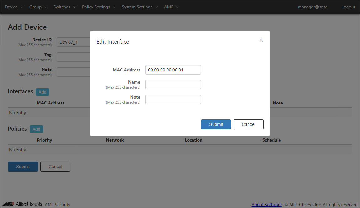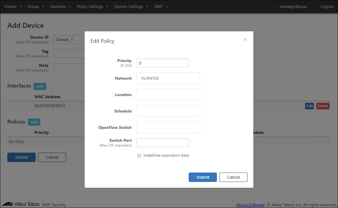 Click "Add" in "Policies" section to specify a network to assign to the device.