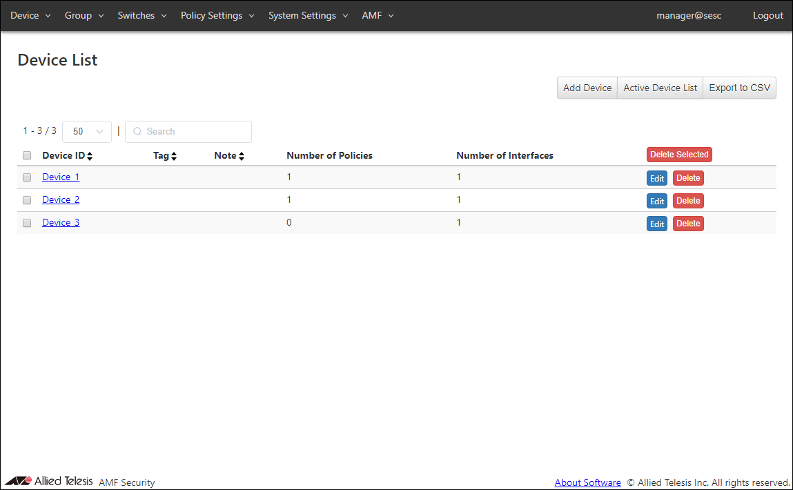 Once the connection between AMF Security and the AMF Master is established, connected AMF nodes are displayed on the Switches > Active AMF Member List page.