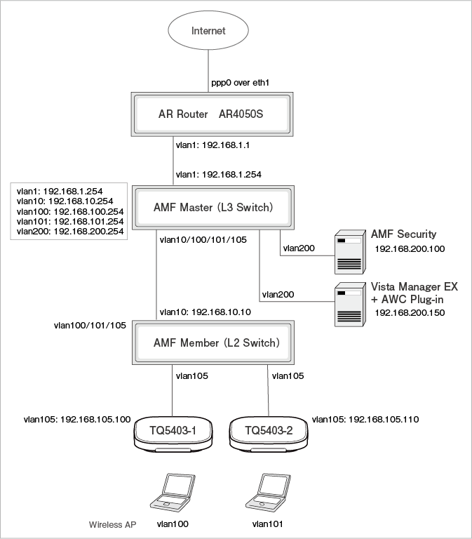 AMF Master (L3 switch), AMF Member (L2 switch), VLAN for wireless terminal communication