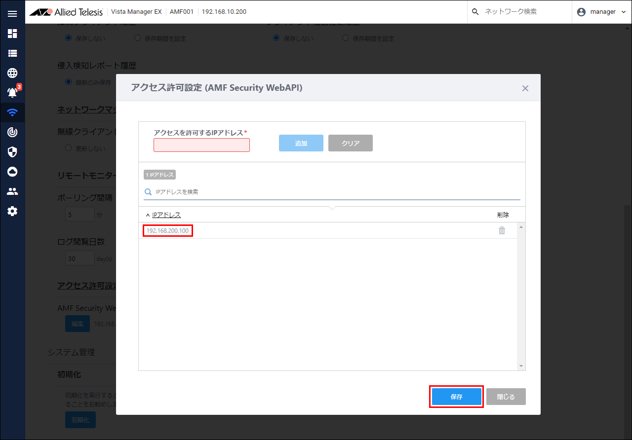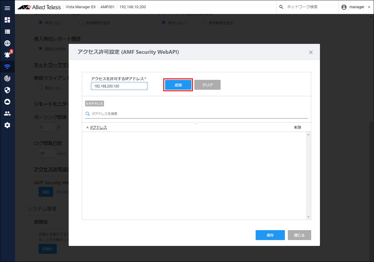 - Enter the AMF Security IP Address "192.168.200.100" as the IP Address to allow access, and click the "Add" button.