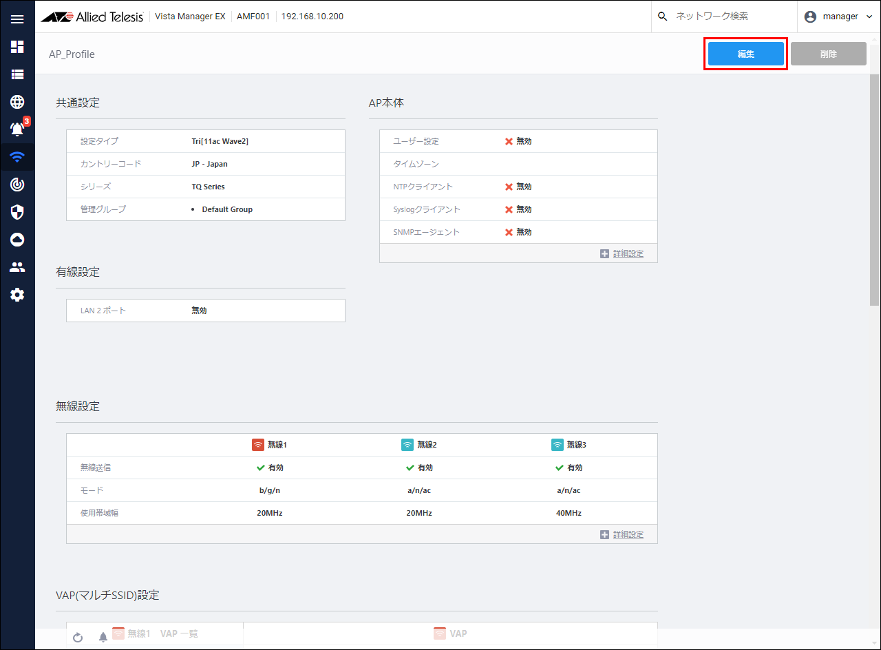 AMF network settings, wireless AP registration (created AP common settings have been applied to TQ)