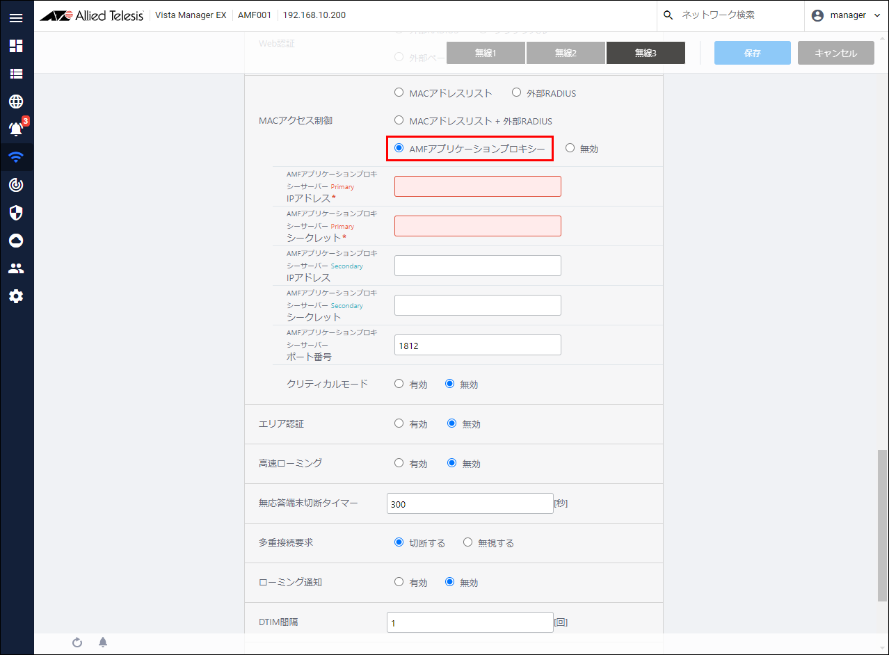 - Set AMF Application Proxy Server (AMF Security) information in the AP common settings / VAP (multi-SSID) settings of the AWC Plug-in.
