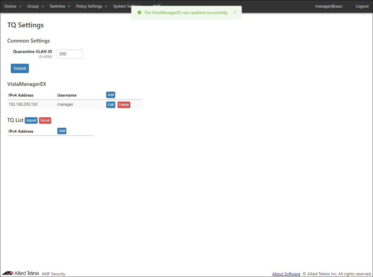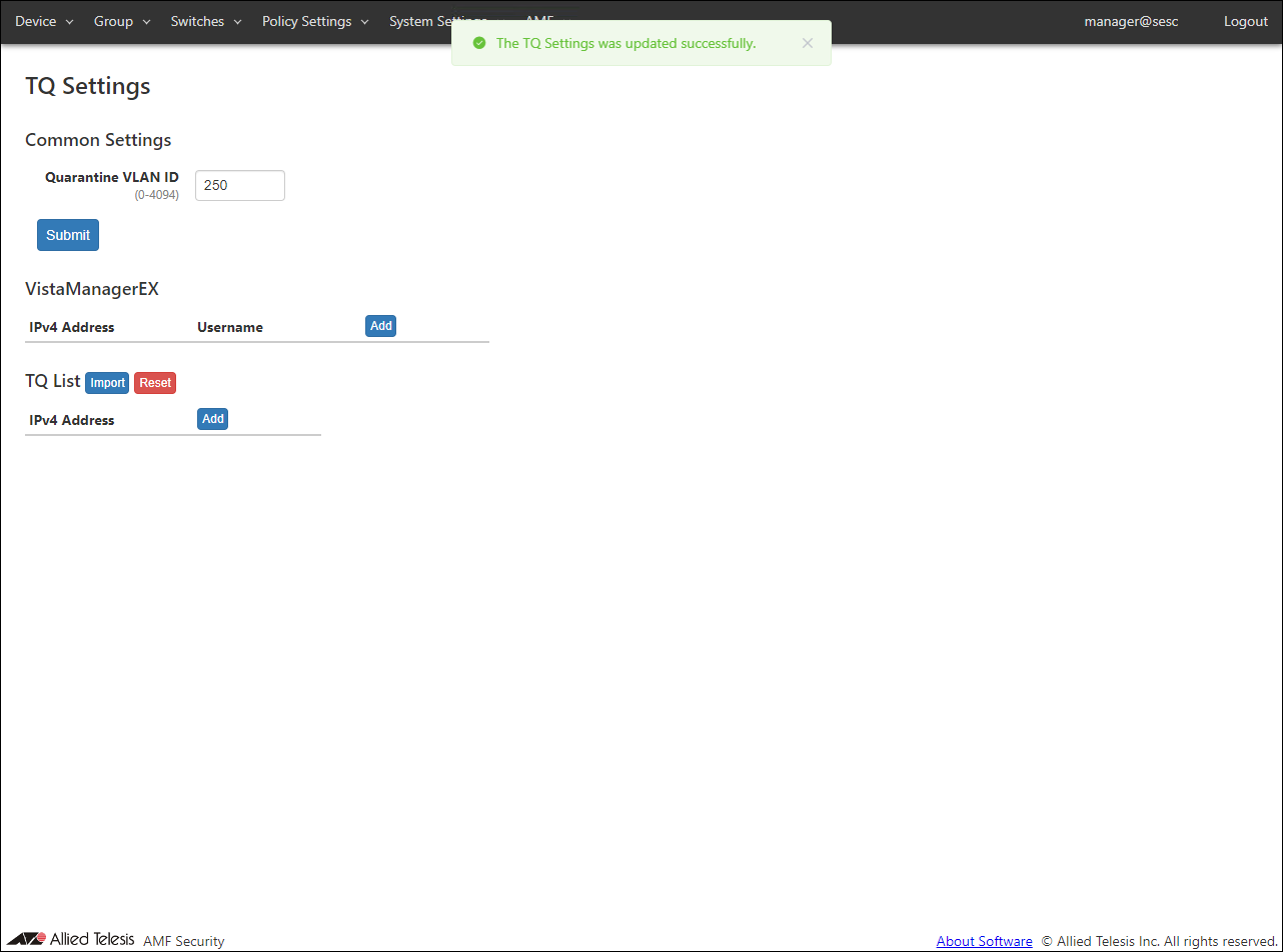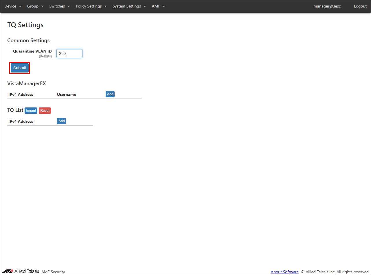 - Open the AMF > TQ Settings page to set the quarantine VLAN ID, Vista Manager EX, and TQ information.