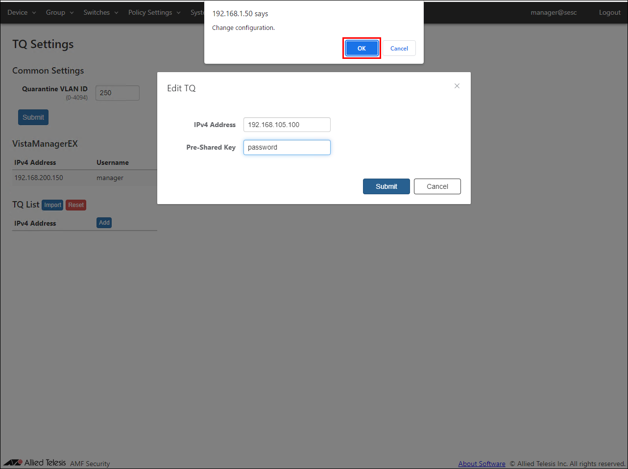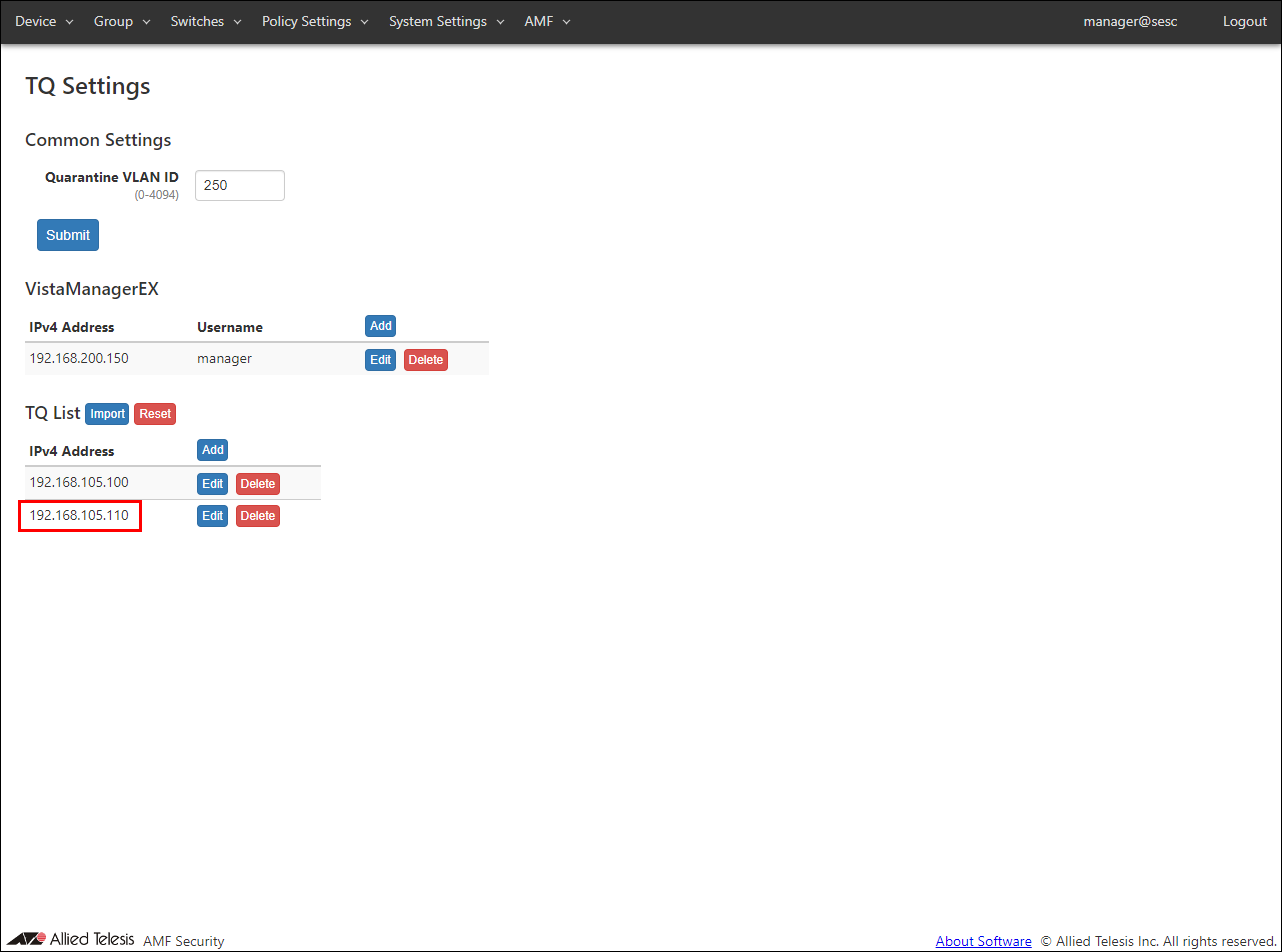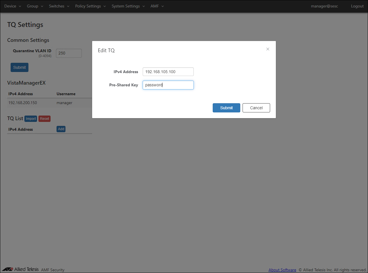 - Open the AMF > TQ Settings page to set the quarantine VLAN ID, Vista Manager EX, and TQ information.