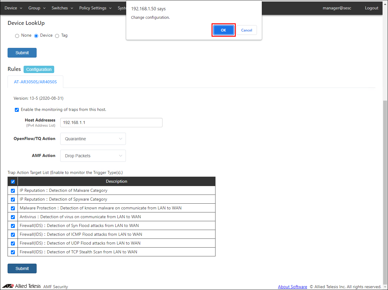 - Set rules for UTM-related functions of AT-AR3050S / AR4050S used as an application linked to AMF Security