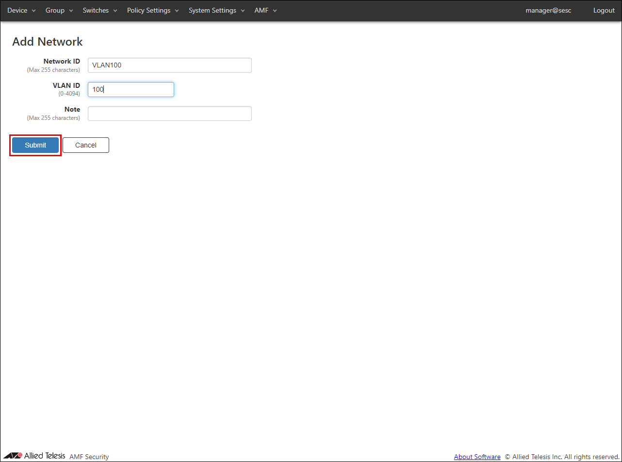 - To register VLAN100, enter the network ID and VLAN ID as follows, and click the "Submit" button.