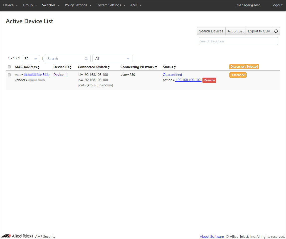 AMF Security, a wireless terminal connected to TQ, authenticates based on the registered authentication information.You can check the result of authentication on the Devices > Active Device List page.