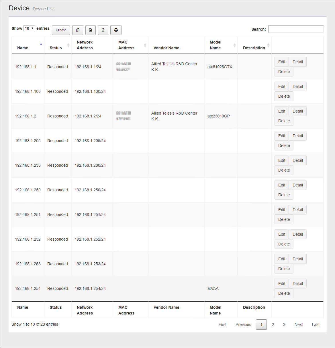 NoteWhen manually adding a device, the MAC address, IPv4 address, and vendor name may not be displayed on the Device list page depending on the model. In that case, perform the auto-discovery. Depending on the result of the Auto Discovery, the information is displayed.