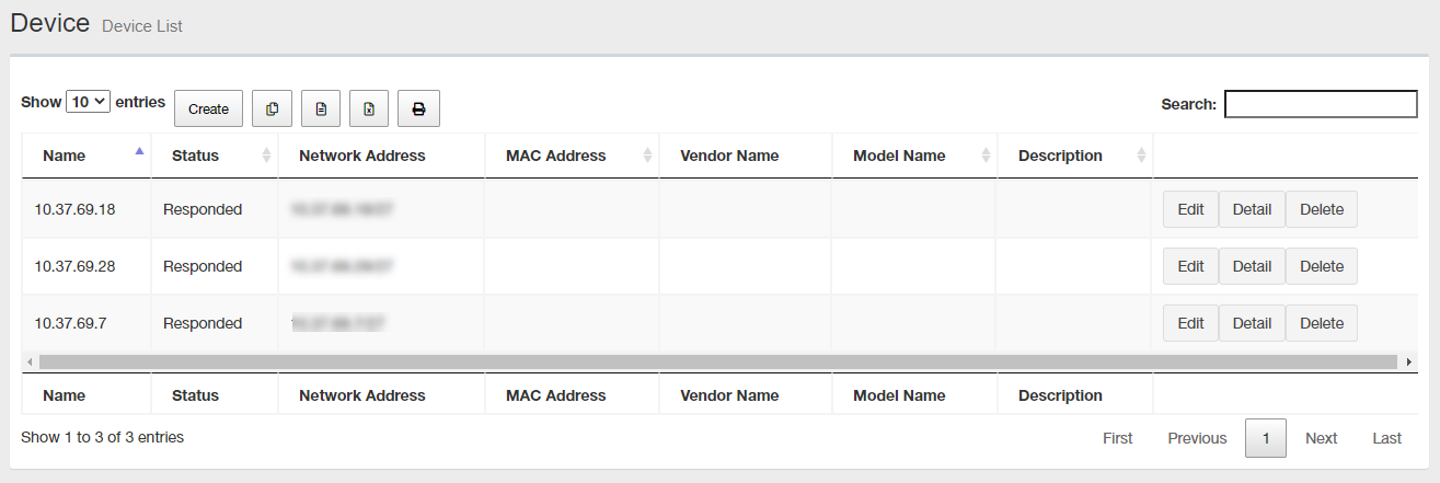 "SNMP Parameter List" page can be reached from "Add Subnet", "Edit Subnet", "Add Subnet" or "Edit Device" page.