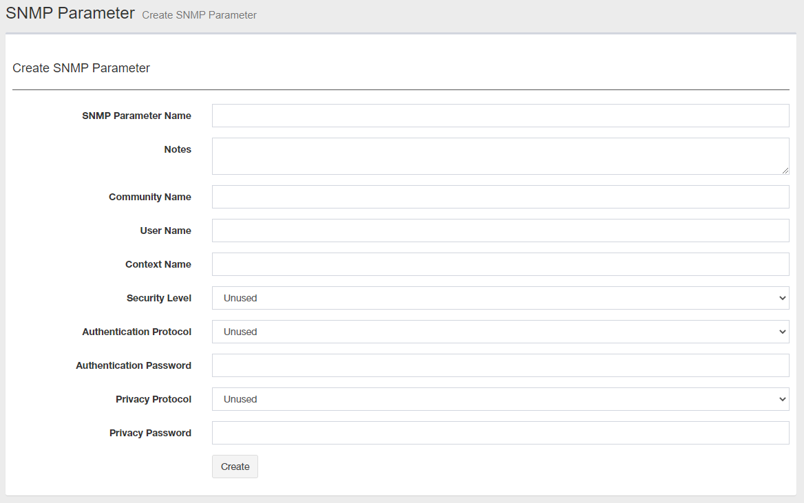 You can create a new SNMP Parameter on the Create SNMP Parameter page."Create SNMP Parameter" page can be reached from the SNMP Parameter List page.
