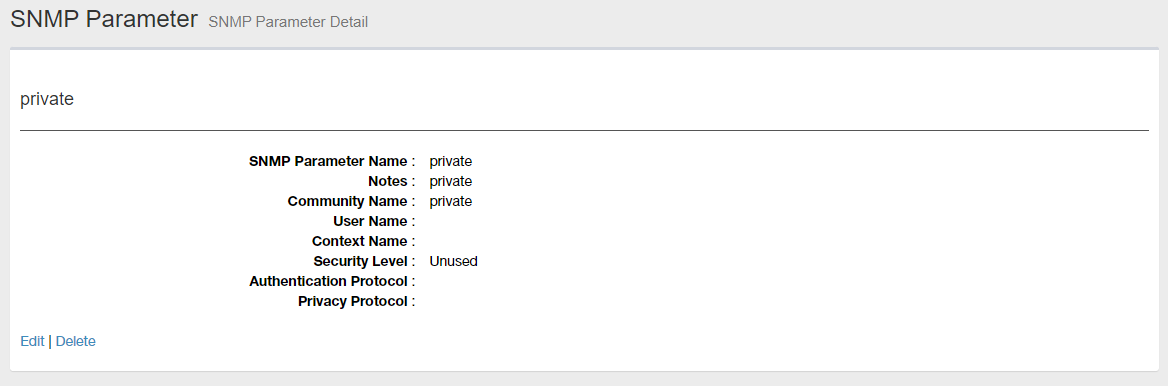 A SNMP Parameter is a group of SNMP configurations such as community name, username, context name and security level. It is used by the SNMP Plug-in to access devices via SNMP.