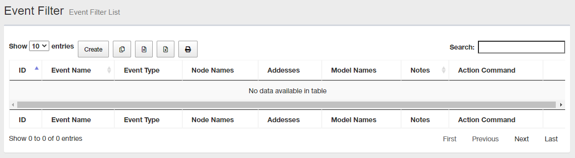 Shows the event filter list (Event Name, Event Type, Node Name, Node Address, Node Device Name, Memo and Action Command) on another browser window or tab and opens a print dialog box. You can filter target subnets with "Search" box. "Number of items on the page" and the current page do not affect an output. |