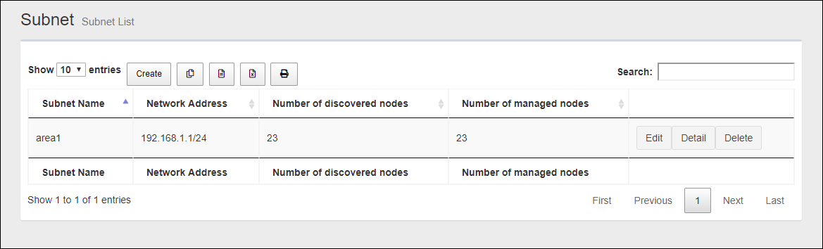 Shows the subnet list (name, network address, number of detected devices and number of monitored devices) on another browser window or tab and opens a print dialog box. You can filter target subnets with "Search" box. "Number of items on the page" and the current page do not affect an output. |