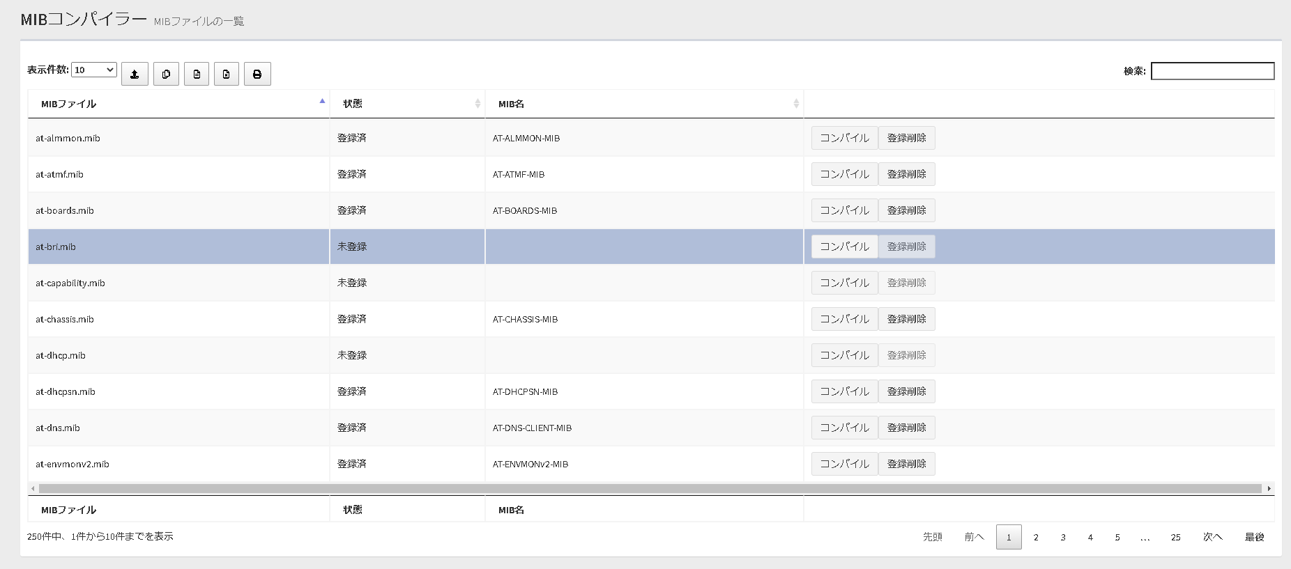 List the registered MIB files in the pop-up window or new tab of the web browser and display the print dialog. You can filter target subnets with "Search" box. "Number of items on the page" and the current page do not affect an output. |