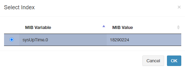 | "Cancel" button | Stops selecting MIB Variables and closes the Select Index dialog. |