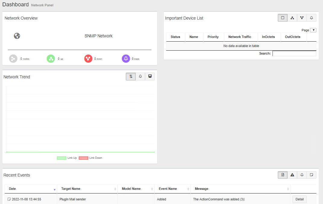 Because there's no subnets in the Network Tree at the first login, "Network Overview", "Device List By Importance" and "Network Trend" panels look empty. "Event List" only shows events related to the SNMP Plug-in server.