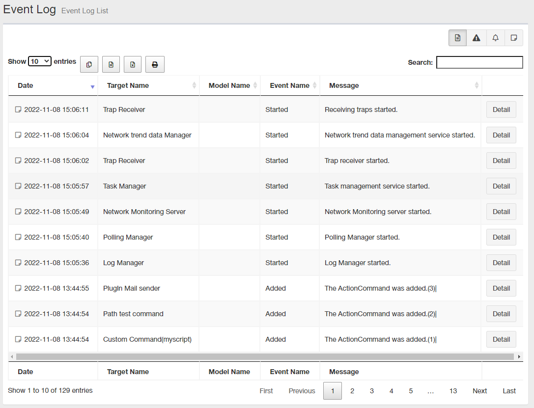 The "Event Log List" page allows you to review, copy, export and print event logs for nodes and the SNMP Plug-in server. Supported export formats are CSV (comma-separated values) and Excel book (extension .xlsx. Microsoft Office 2007 or later).