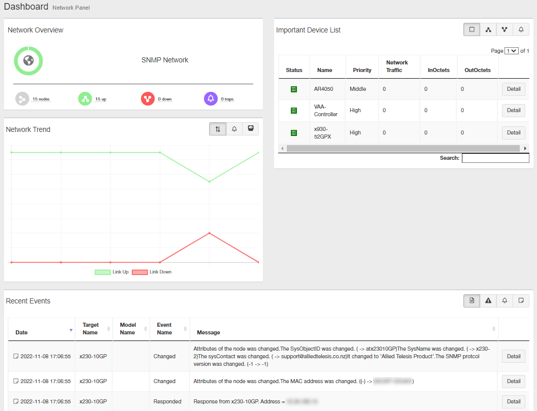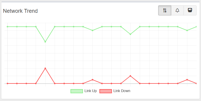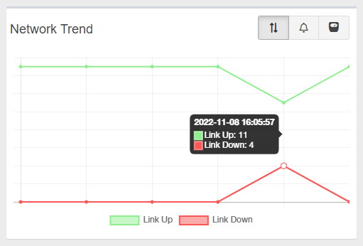 "Network Trend" shows the trends of various data using a line chart (with 1 hour interval) such as the numbers of monitored devices in UP and DOWN states, the number of monitored devices sending traps and the amount of traffic sent/received by monitored devices.NoteWhen the monitored device is registered, if it fails to communicate with the SNMP plug-in, the trend graphs will not be updated. When registering a monitored device, please make sure that it can communicate properly before deleting or adding the device.