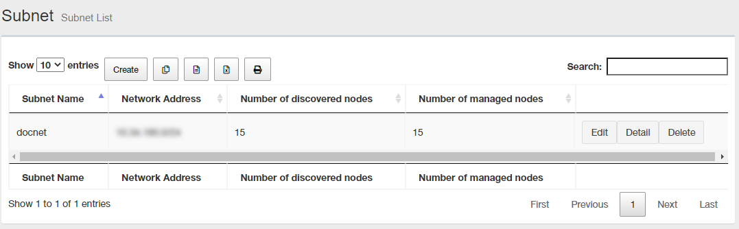 Shows the subnet list (name, network address, number of detected devices and number of monitored devices) on another browser window or tab and opens a print dialog box. You can filter target subnets with "Search" box. "Number of items on the page" and the current page do not affect an output. |