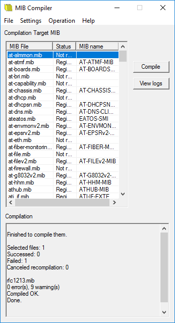 - MIB files in the specified directory are listed in "Target MIB Files". Select MIB files to compile in the list and click "Compile".