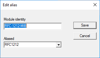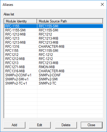 To define a new alias, click "Add" then enter an alias (Module Identity) and an original MIB name (Aliased) and click "OK" on the following dialog box.