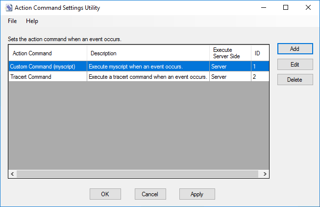 | Add | Lets you add an action command. Enter required parameters and click "OK" on "Action Command Properties" dialog box. |