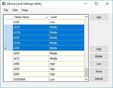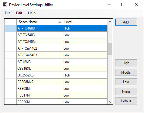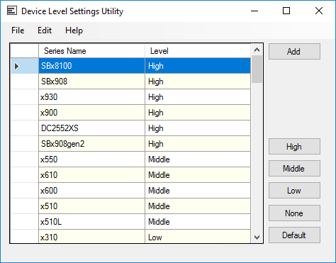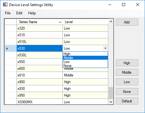Set the specified device level to the selected series. When you click "Default", device level of the selected series will be back to its default setting. When apply "Default" to the series you added, the series will be deleted from the list (same as specifying "None"). |