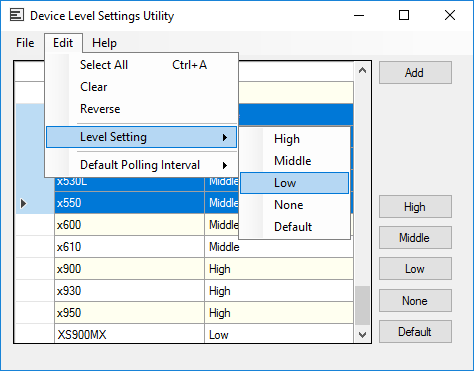 - Specify a new device level by clicking one of "High", "Middle", "Low" or "None" button, or by selecting one of "High", "Middle", "Low" or "None" from "Edit" > "Set Level" submenu.