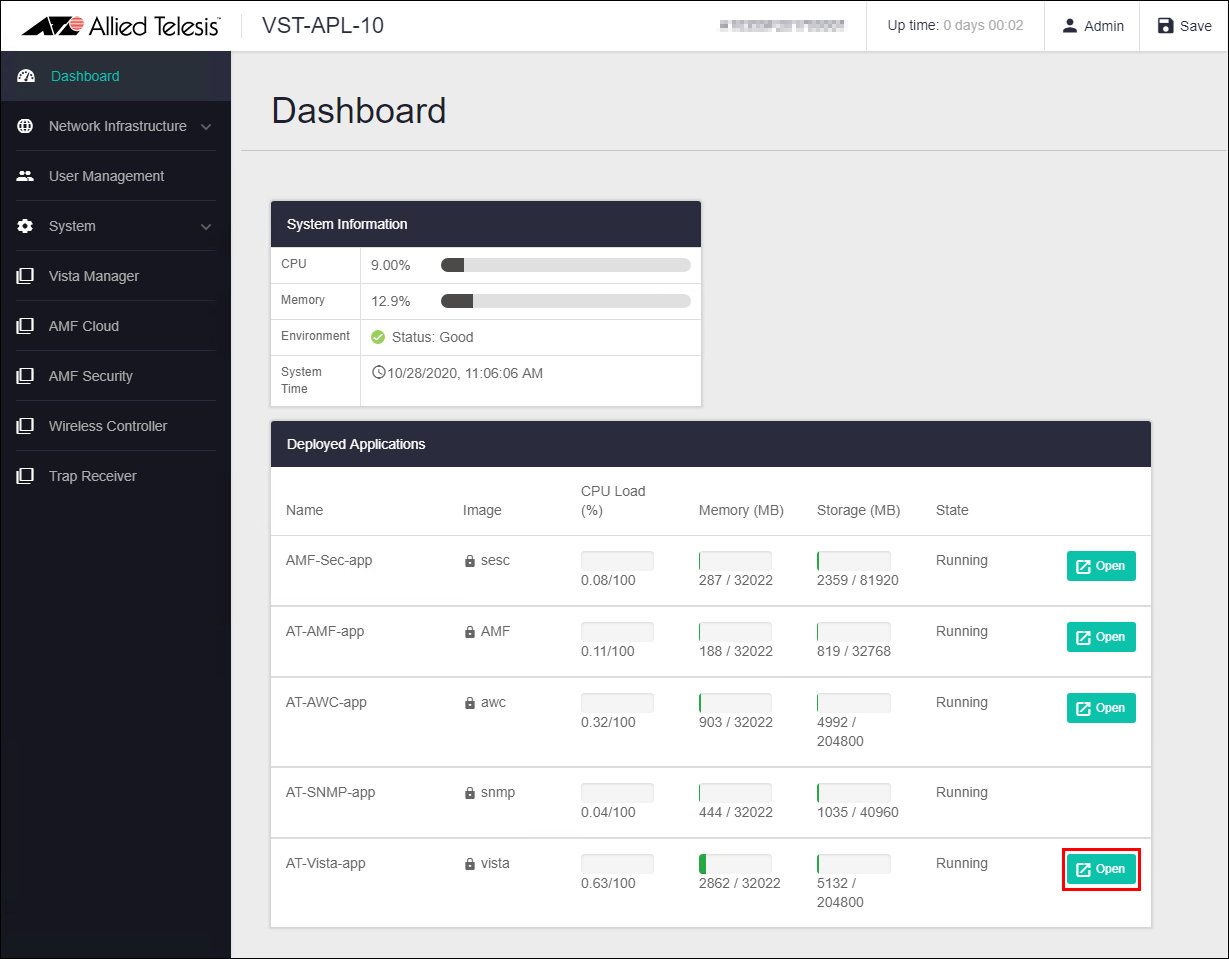 - On the Dashboard page of VST-APL, click the "Open" button in the AT-Vista-app section.