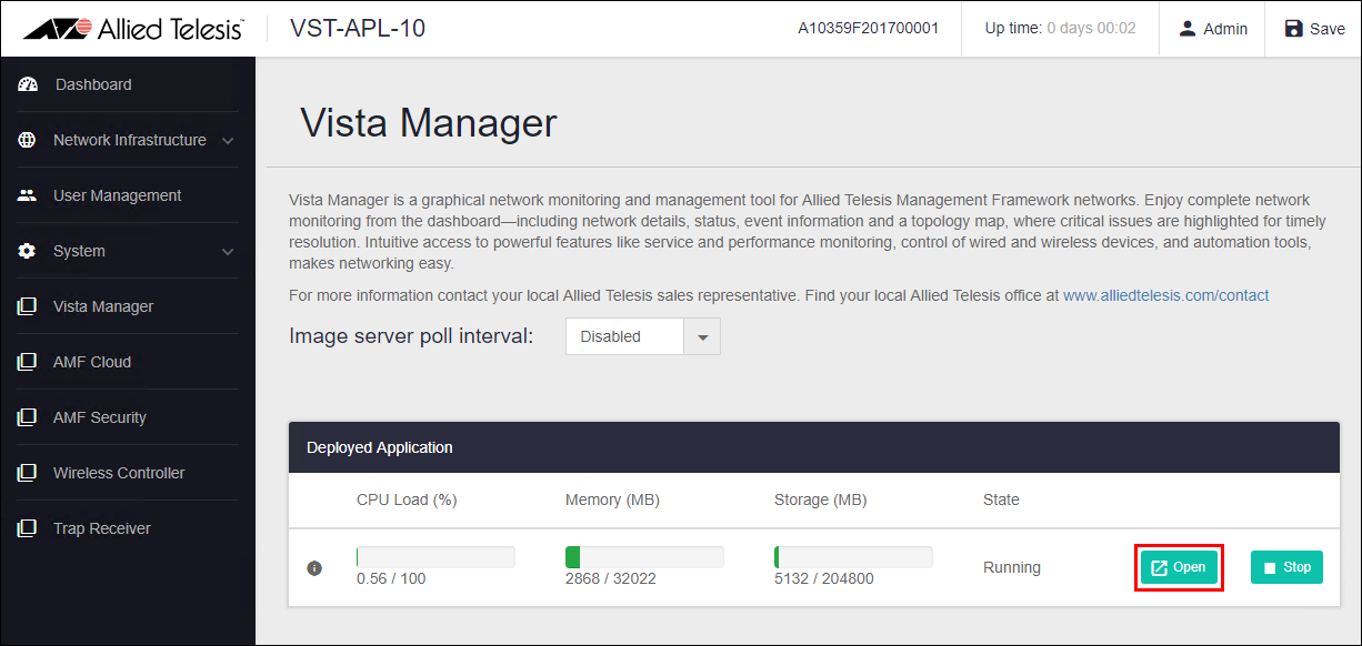 - On the Vista Manager management page of VST-APL, click the "Open" button.