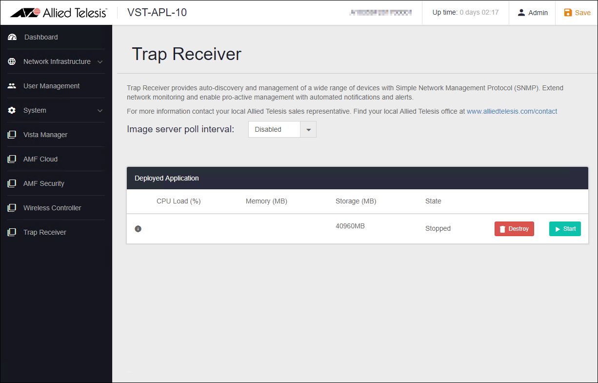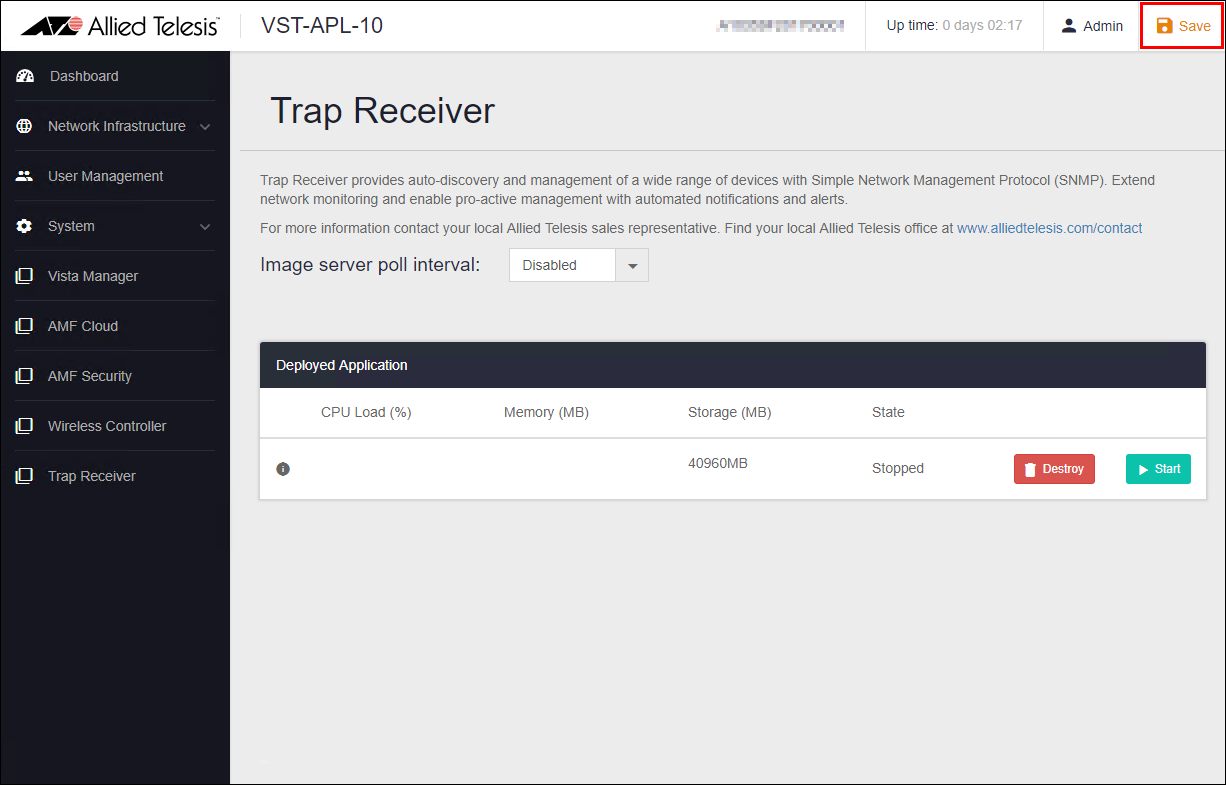 - When the State item becomes "Stopped" and the "Destroy" and "Start" buttons are displayed, Trap Receiver stop is complete.