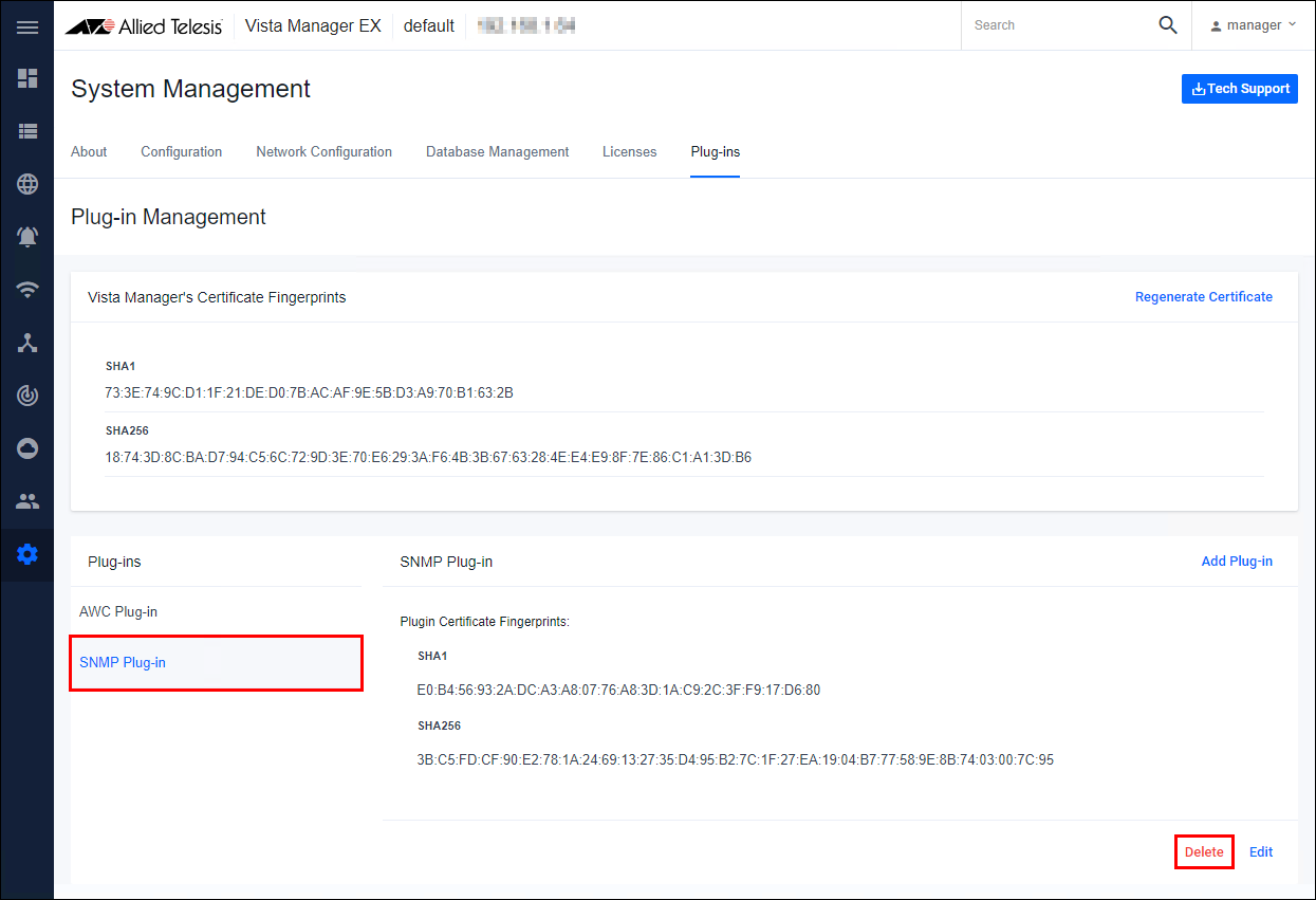 - Open the Plug-in Management page in the Vista Manager application, click "SNMP Plug-in", and then click the "Delete" button.