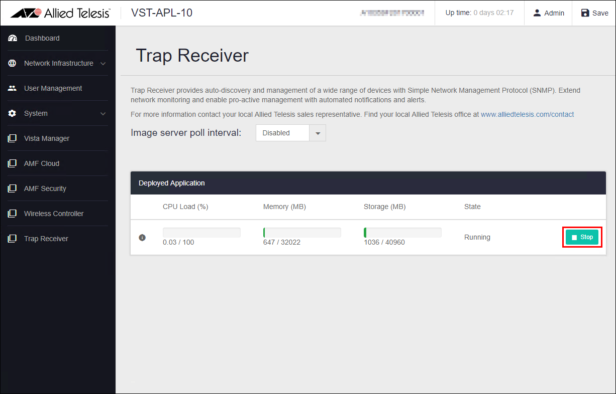 - Click "Trap Receiver" in the menu field on the left side of the page, and then click the "Stop" button on the Trap Receiver management page.